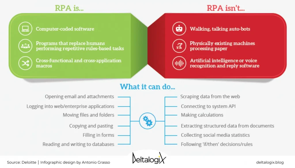 La RPA utiliza bots que imitan acciones humanas sobre aplicaciones digitales: hacen clics, rellenan formularios, copian datos, descargan archivos y más. Son como asistentes invisibles que trabajan 24/7 sin cometer errores ni pedir vacaciones.